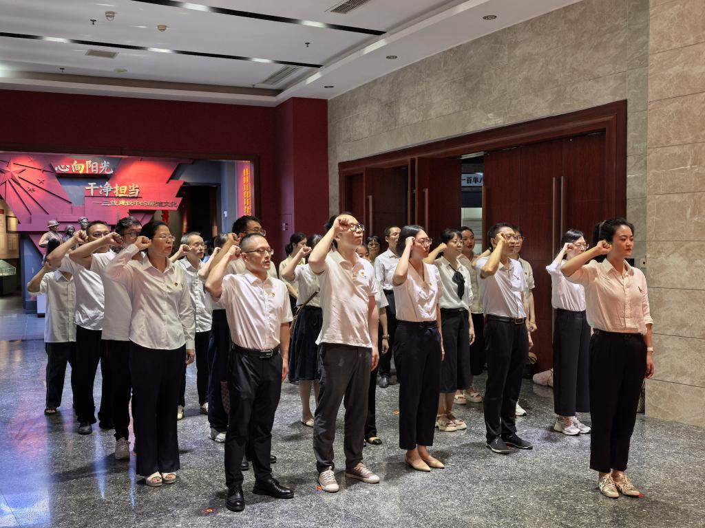 6月27日下午,党委书记王鹃带领教师党员参观中国三线建设博物馆,她带领全体同志面向鲜红的党旗,紧握右拳,重温入党誓词。誓言铿锵,党员教师们立志把“不忘初心牢记使命”作为教书育人终身课题。